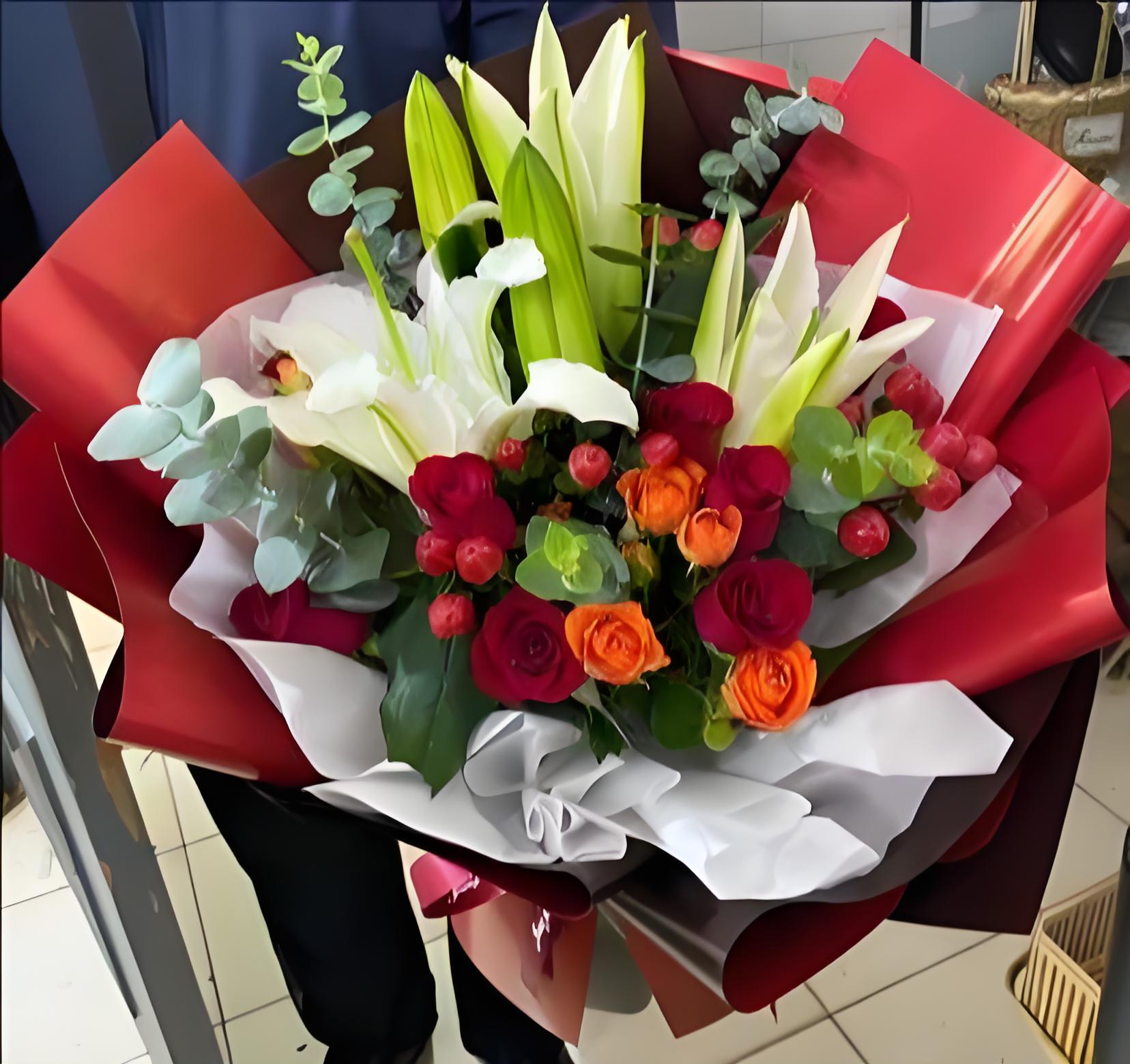 黄石铁山区花店包11枝红玫瑰、2枝多头白百合、6枝橙色多头玫瑰、红豆、尤加利叶包装:酒红色包装纸扇形包
